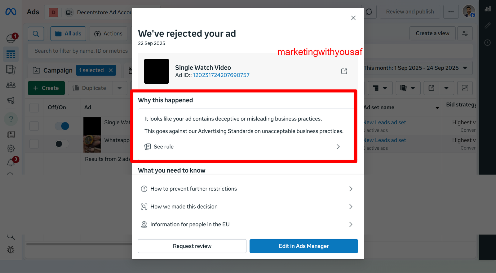 The ad has been rejected with unacceptable policy with dig deep analyze the problem and solve